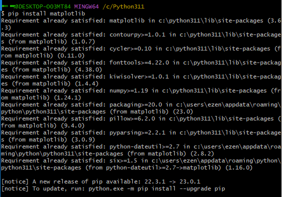 ' pip install matplotlib ' 이라는 명령어로 아래와 같이 설치 & 업데이트 확인을 해줍니다.