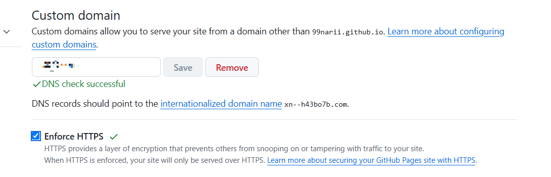 그리고 한글 도메인을 그대로 적용하고 Save를 해주면 잠시 후에 깃허브가 알아서 퓨니코드로 변환해주고,